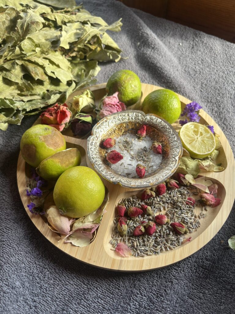 Raw honey with a touch of lemon to draw circulation to the skin and nourish it; a mineral salt scrub for exfoliation and stimulation of the lymphatic system.